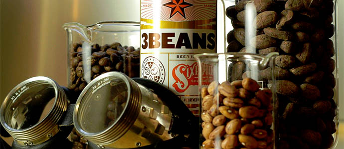 To make 3Beans, Sixpoint combines three types of beans, as might be expected from the name. Sprouted Roman beans (somewhat similar to kidney beans) have been added to the mash, a practice that was used historically by some ancient to supplement barley when supplies ran low. Mast Brothers provides the husks of cacao beans — left over when the inner nibs are shelled to make rich chocolate bars — and these are also added to the mash. Stumptown provides the third bean: after fermentation, the beer is blended with a specially cold-brewed coffee. The resulting liquid is aged on American oak