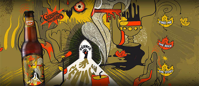 A chalice, key, owl, candle, ghost and hand reaching from the ground are featured on the thriller-themed orange-green-tan label — an appropriate lead-up to the Halloween season. The brewery’s spiral/starburst/moon insignia is repeated on the cap and embedded in the design, and there’s enough of a rebus in the rest of the packaging to absorb your attention if you’re the first to arrive at the party and your smartphone is out of juice, or if you simply miss the golden age of psychedelic album covers.