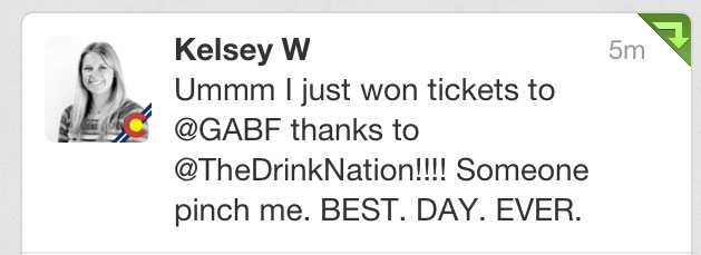 If you’re going to GABF, keep an eye out for The Drink Nation’s table, we’ll have t-shirts available and be handing out sunglass, bottle openers and other fun things. Congrats, Kelsey! We can see you love beer — we’ll catch you at the fest.
