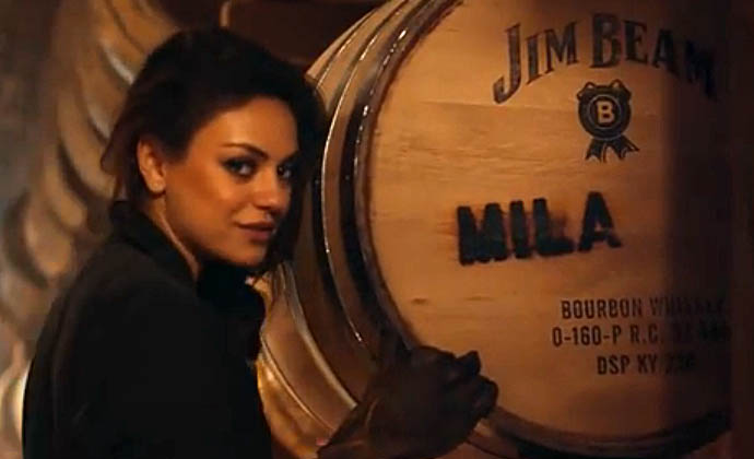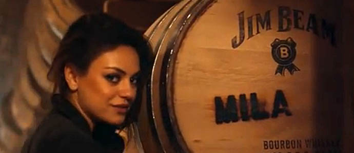 In the first of a series of new ads popping up this week that reinforce the tagline “Make History,” Kunis walks and talks through a montage that traces Jim Beam’s 200 years. In another she wields a red hot branding iron to make her mark on a barrel of bourbon.