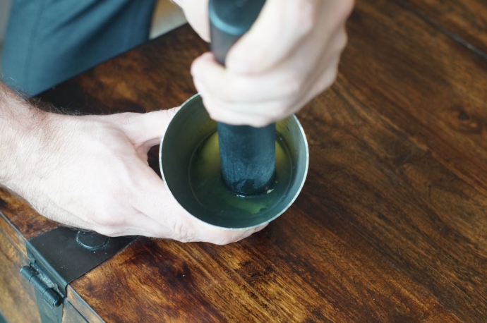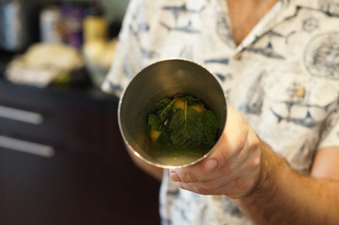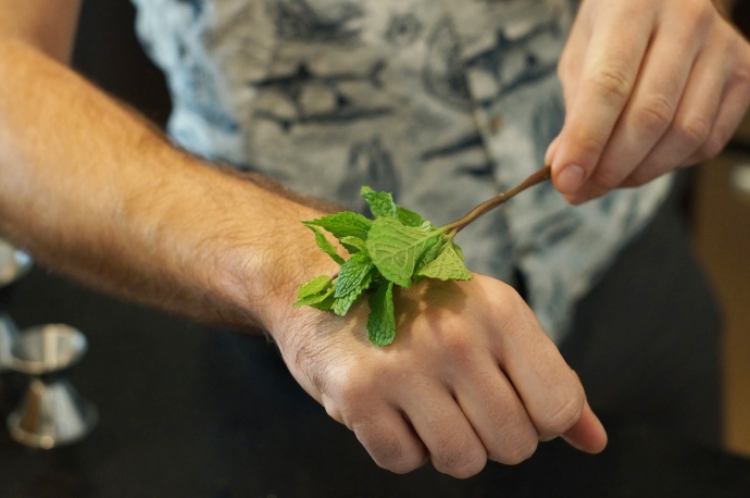 Gently wake mint sprig by slapping it lightly on the back of your hand. This technique "wakes up" the mint by activating the aromatics on the leave's surface.