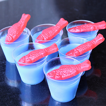 Once fully gelled, top with Swedish fish that have been soaked in vodka and serve