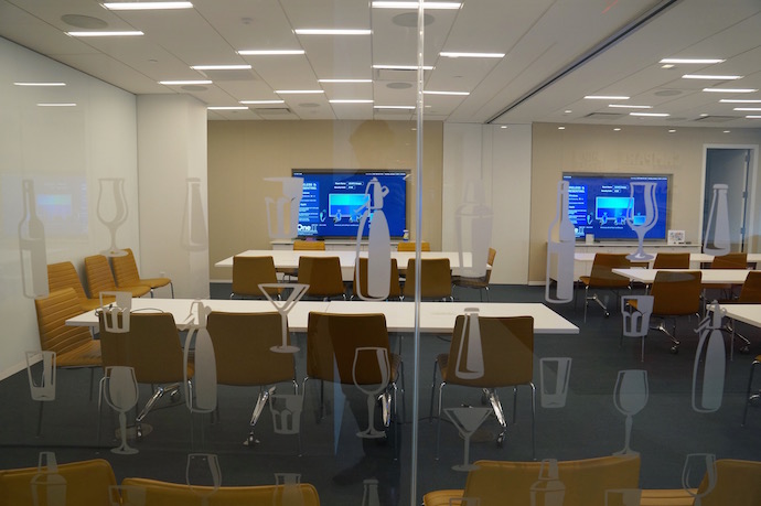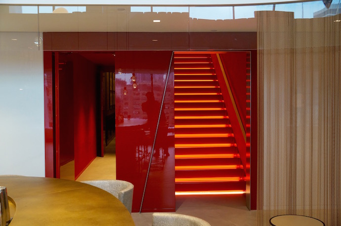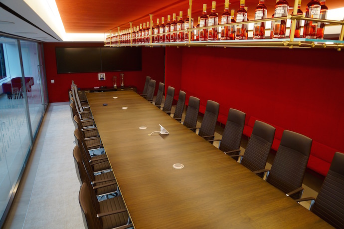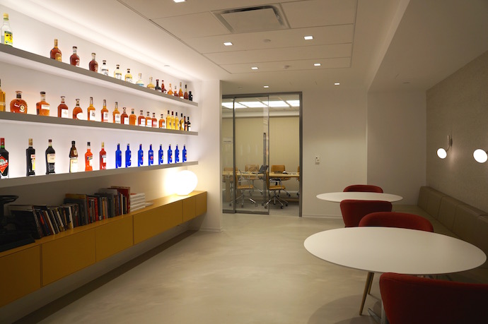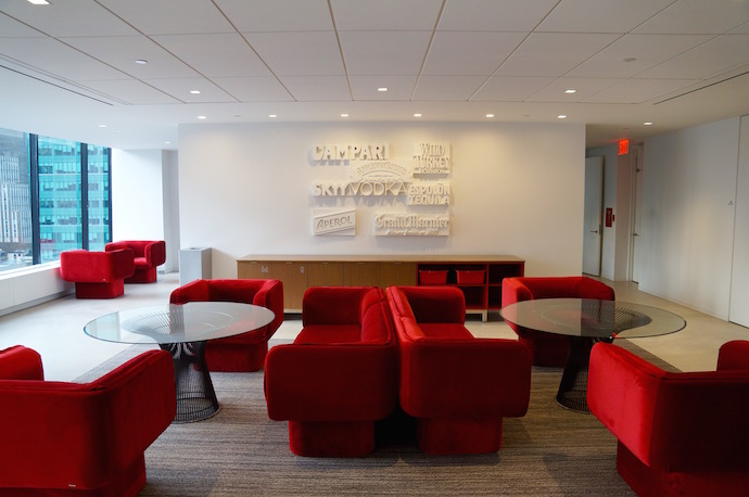 The conference rooms are also themed after many of Campari's signature products; for example, Campari's conference room is outfitted in red, with bottles adorning the ceiling.