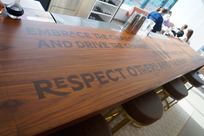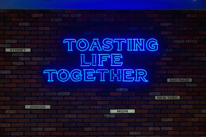 This particular bar is adorned with some of the "behaviors" of the Campari group, including "be humble and hungry," "respect others and the planet," and "build more value together."
