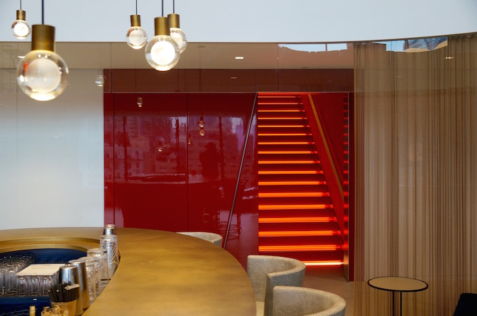 As you search for the fourth bar in the space, descend the red staircase, and keep an eye out for the vintage scotch and Campari bottles in cases along the back wall. The design of the stairwell was meant to make you feel like you're floating through a giant bottle of Campari.