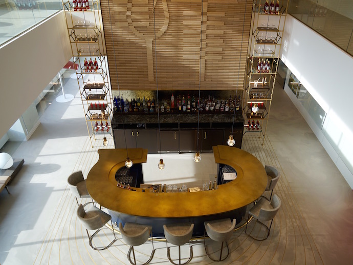 Naturally, there are plenty of bars within the Campari office. Aside from the Cafe and Concierge bars, you can also visit the gilded Fortunato bar. This sunlit, luxurious bar, which is shaped like Campari's classic C, sits beneath a 1,500 foot wooden mural, which was inspired by Futurist artist Fortunato Depero (who once designed works for Campari in the 1900s).