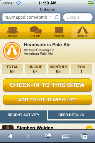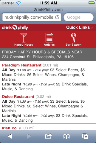 (Warning! Shameless plug!) Like Untappd, the Drink Philly mobile app can be added to your home screen via m.philly.thedrinknation.com on your mobile device. It is a great way to find the best happy hours and drink specials when you’re out in and around Philadelphia. GPS-enabled, the app will bring up the specials closest to where you are – or you can search by neighborhood, day, drink prices, and atmosphere. Never go thirsty again!