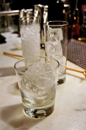 For classic cocktails such as an Old Fashioned, bartenders will use a solid lump of ice, hand-carved from large block. The big piece of ice – almost the size of the glass – has a high volume and low surface area, so it melts extremely slowly, providing cooling action while avoiding watering down the booze. At Philadelphia’s Franklin Mortgage & Investment Co., the “Coal Cracker Cocktail” is a current example of such a tipple, composed of rye whiskey, Galliano, blackberry syrup, sarsaparilla tincture and Angostura bitters. Manager Colin Shearn tells us the Franklin gets their block ice delivered in big 50 to 75-lb blocks.