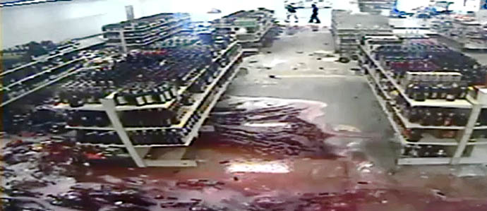 An employee restocking nearby heard a little shift, according to the Sheboygan Press, and then he advisedly ran the other way as racks came crashing down. Though the incident occurred over the summer, the “vintage” smash is only now making national news, because the store – in a commendable show of good attitude – posted a YouTube video made from surveillance footage of the event. No use crying over spilled wine (especially if it gets you a viral video).