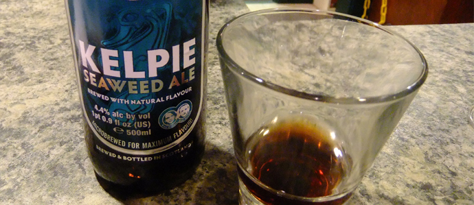 Brewed by Williams Bros. with real seaweed in the mash, Kelpie is a 4.4% ABV session beer that’s probably unlike any you or I have ever witnessed. It pours the color of Coke, with a thin fingernail’s worth of head bathed in the hues of foamy river pollution, and smells of fresh barley and alcohol. The body is of a pleasantly medium weight, perhaps heavier than one would expect of such a low-alcohol brew.