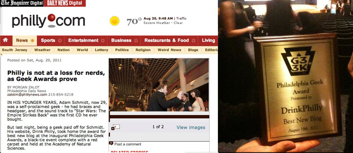 In one of the coolest events we have ever partaken in, Drink Philly took home the award for Best New Blog by the Philly Geek Awards, hosted by Geekadelphia.