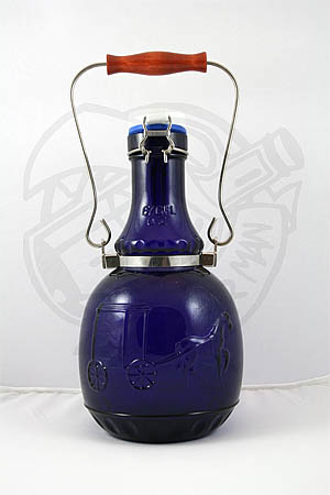 These hand-blown jugs features a stainless steel band that secures a metal wire handle to a wooden handle top, designed for comfortable carrying. The bail edition was designed by Hanover, PA-based Benjamin Arthur to recognize the time when patrons first carried their fresh beer home in buckets. Each is 11½ inches tall and holds two liters of liquid, with a porcelain flip-top stopper and durable rubber seal.