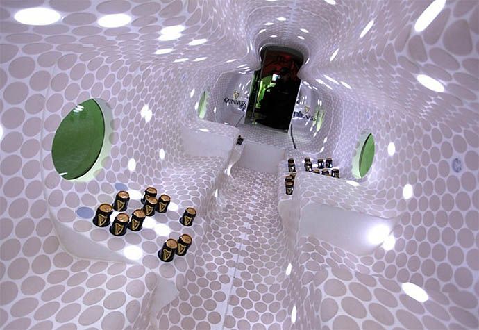Designed by London-based Jump Studios, the interior reflects the Guinness brand tagline “Alive Inside” with a swooshing series of curved benches and beer holders. Constructed from glass-reinforced plastic (GRP), the seating and tables flow seamlessly into one another. The entire interior surface is covered with rubber discs, some of which hold LED lighting, and others of which serve as a place to set your can of brew.