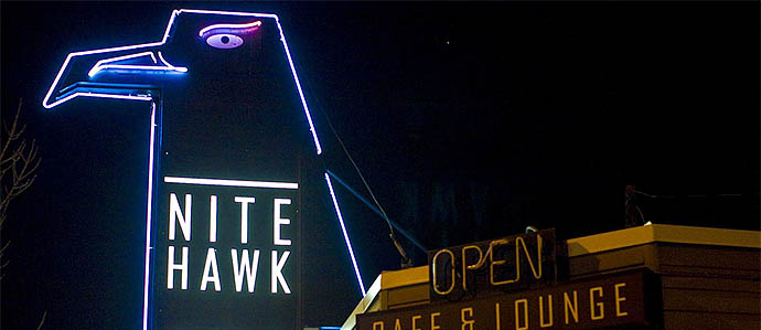 A guy comes through the door of the Nite Hawk, and approaches the bar next to me. He’s wearing black jeans, a black hoodie, a metal studded belt, and headphones. Around his neck is an ID badge from one of the railcar companies out by the port. He orders a beer and a shot of well whiskey, tips out the bartenders five bucks a piece, and goes back to the pool tables.