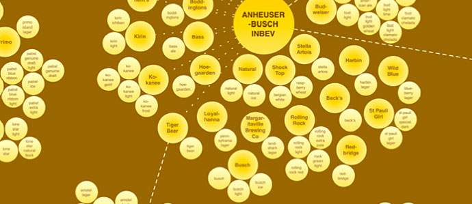 Phillip H. Howard, assistant professor at Michigan State University, recently showed just how close to reality that is with a diagram that connects the top 13 grossing beer companies with their respective brands. Howard notes that with their combined labels, AB InBev and MillerCoors make up more than 75% of sales in this country (which is in fact home to more than 1,800 different breweries).