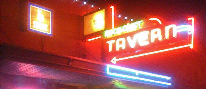 It’s been difficult to find anything but cozy comfort from the Mock Crest on this particular evening, however. Classic soul and Motown plays on the stereo. A fellow at the corner table enjoys the dinner special of a plate of German sausages, onions, and red potatoes. The surveillance camera view of the back patio hanging above the bar is tempered by a photo screensaver of regulars displayed on the cash register, embracing each other and smiling in the same, continuous warm neon glow.
