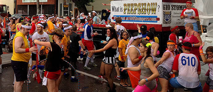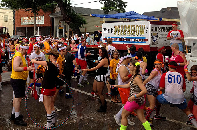 Early afternoon found the parade docking at Le Bon Temps Roule, a casual bar-venue legendary for pre-5 PM partying. Though it rained off-and-on all day, the intermittent soakings dampened BallCrawlers’ spirits not even a little. “It’s like college,” I remarked offhandedly to Nicholas, watching a hula-hooper leap a mud puddle to complete a flying high-five with a mustachio’d bro clad in booty shorts and a headband. He gave me a look. “If you learned to drink in college,” he said seriously, “Consider New Orleans grad school.”