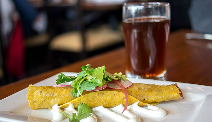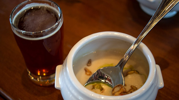 Real green chiles didn’t have time to mellow in this brew, a strong pale ale that also included cinnamon and clove. The spiciness was welcome, however, and did well with a the very rich and creamy bean soup.