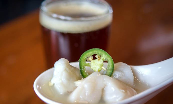 This golden tripel drank nearly like a wine, and it’s no wonder: the beer was mixed with fresh Sauvignon Blanc, Muscat and Gewurztraminer grape juices along with dried chamomile. The liquid did pair well with the marinated squid, which was served with a pomegranate gastrique.