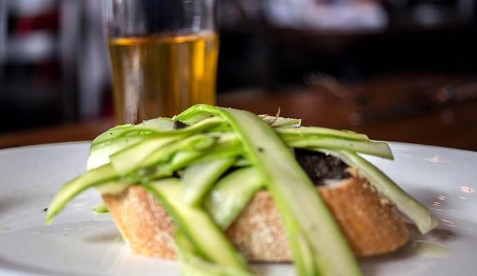 Much more vibrant than its predecessor, this beer brewed with Kaffir lime effused bubble gum notes. It’s fruity banana esters were a good foil for the earthy wild mushrooms and pungent asparagus in the pairing.