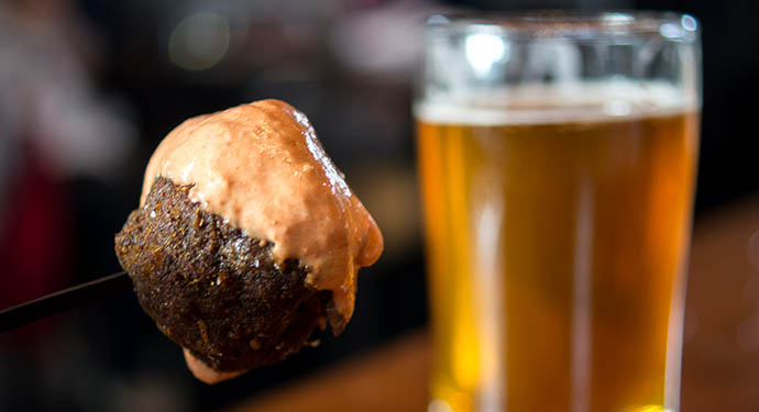 Full of ginger and citrus notes, this strong pale ale was fruity and refreshing, even after its extra years in the cellar. Good thing, because the harissa aioli that accompanied the spicy lamb meatball was nearly overwhelming (though pleasant) in flavor.