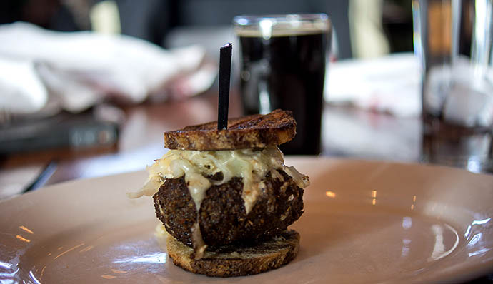 Like a boozy stout, this vintage was black and had toasty notes underlaid by vanilla. The subtleties were nearly lost behind the strong spice of the miniature pastrami burger, served on rye toasts, but the beer provided a welcome clean finish nonetheless.