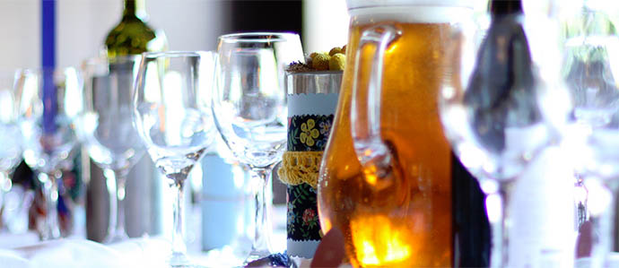 Beverage napkins, coasters, or glassware can all be customized to highlight a theme. Glass table vases can be filled with barley or grains, and we all know a boutonniere comprised of roses and hops would delight mother-in-laws and father-in-laws alike.